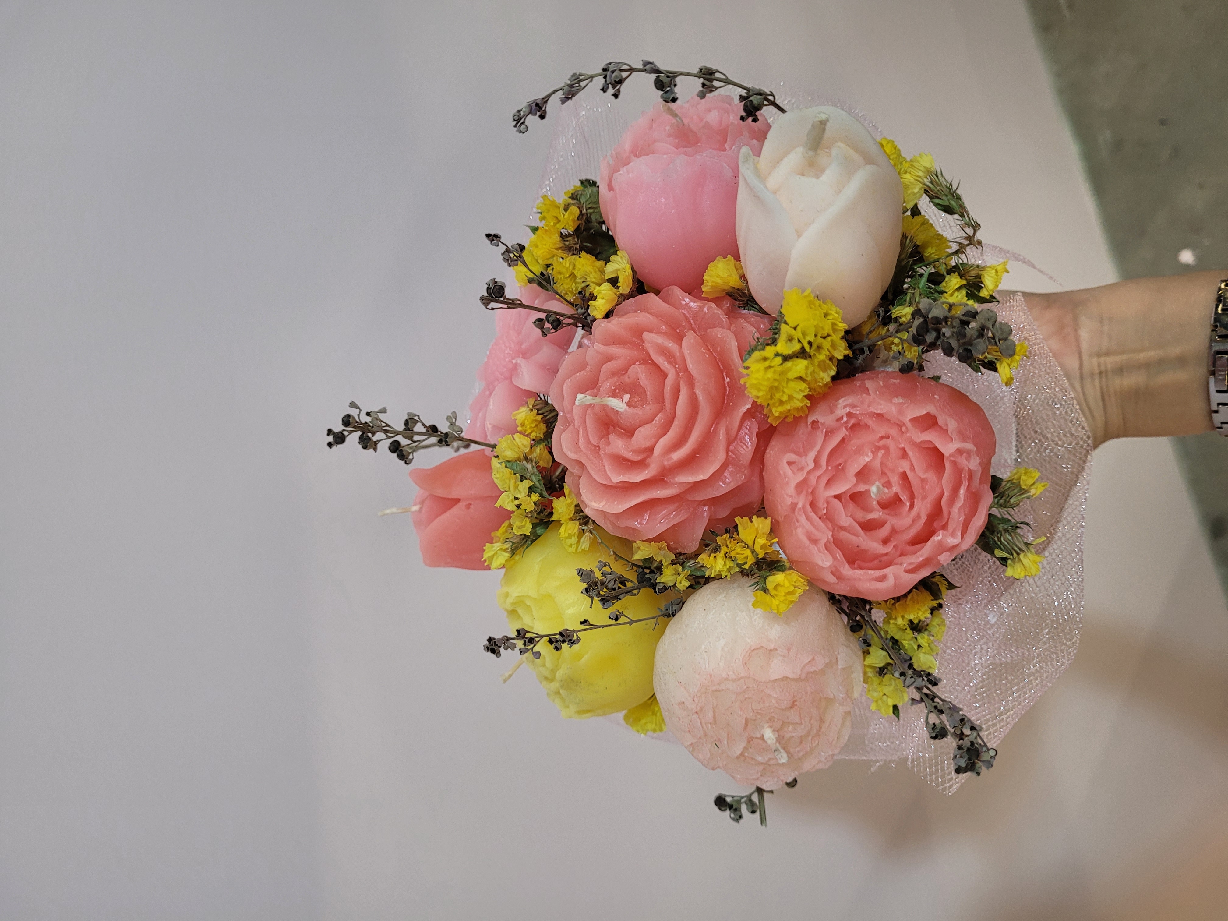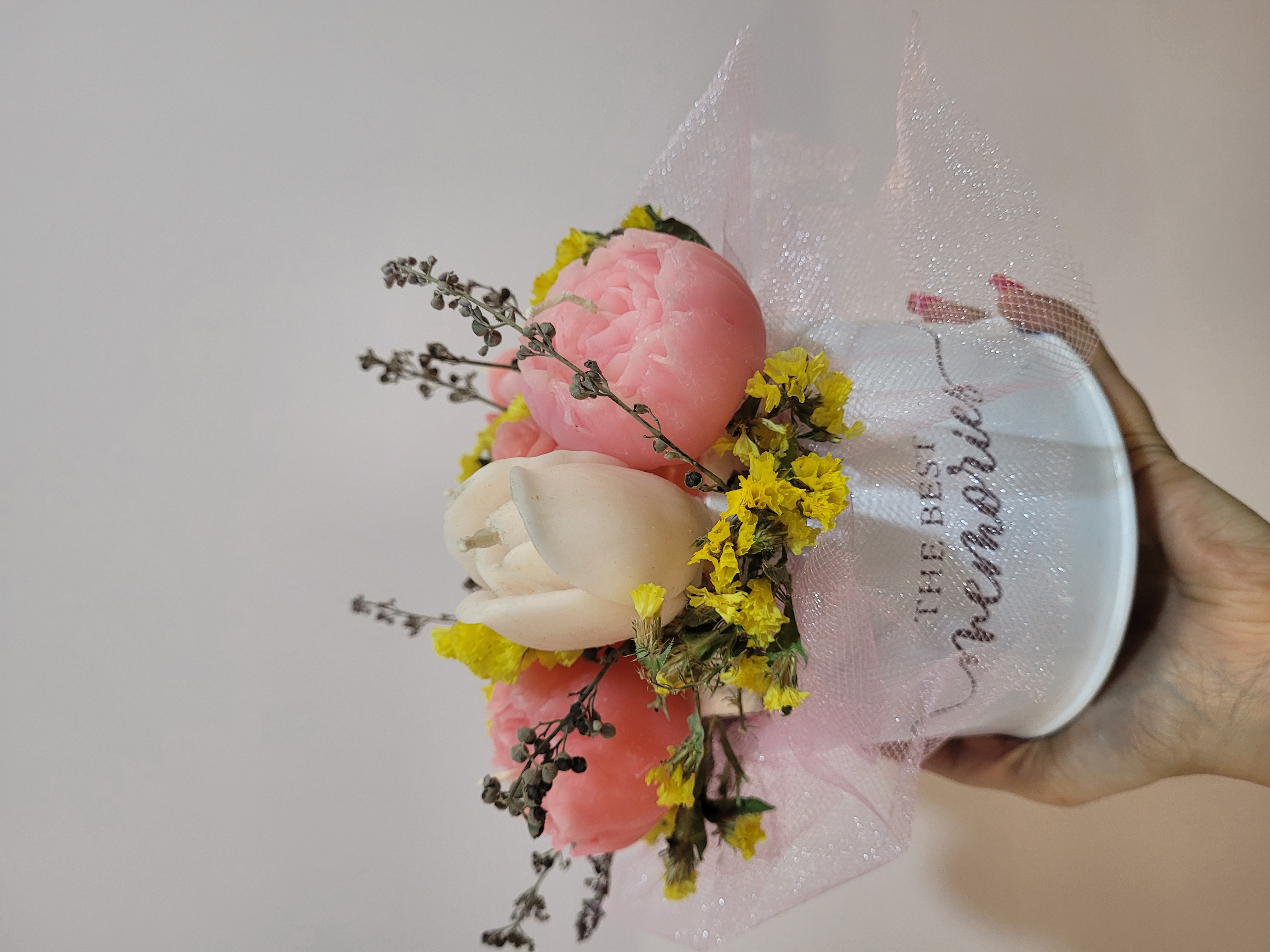 دسته گل شمع صورتی سفید اثری ماندگار مناسب جهت هدیه خاص و لاکچری